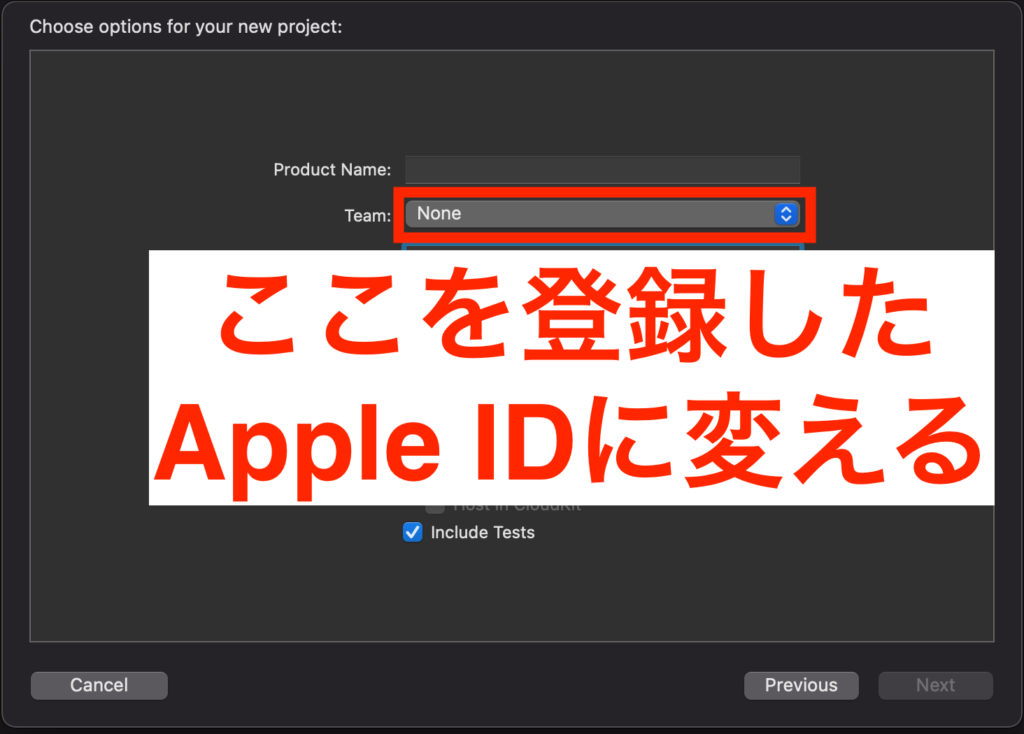 新規でプロジェクトを作成する途中で下記のような画面が出てくるはずです。このときの [Team] の部分を登録したApple IDに変更してプロジェクトを作成してください。